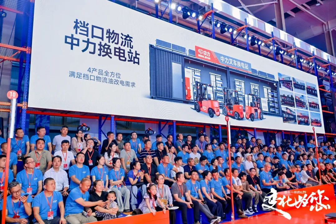 原次629现场,中力换电站处理规划再晋级,带去更多形式换电叉车,2分钟侧推换电更速更复杂,配搭560Ah年夜容量电池破译电动叉车绝航焦急;机能齐里晋升,知足下强度沉工况应用;换电站智能监控体系及时劣化电池分配,让动力哄骗服从再升迁。